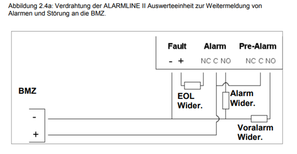 Zur überwachung eines Flammenmelders an einem Koppler einer Brandmeldezentrale wird ein Abschlusswiderstand (EoL) benötigt. Der Gesamtwiderstand soll größer oder gleich 1,5 kOhm sein. Er muss mindestes 0,25 W Leistungsaufnahme haben. Die Verdrahtung des Widerstandes erfolgt über die Klemmen 5 und 6 im Melderkopf.